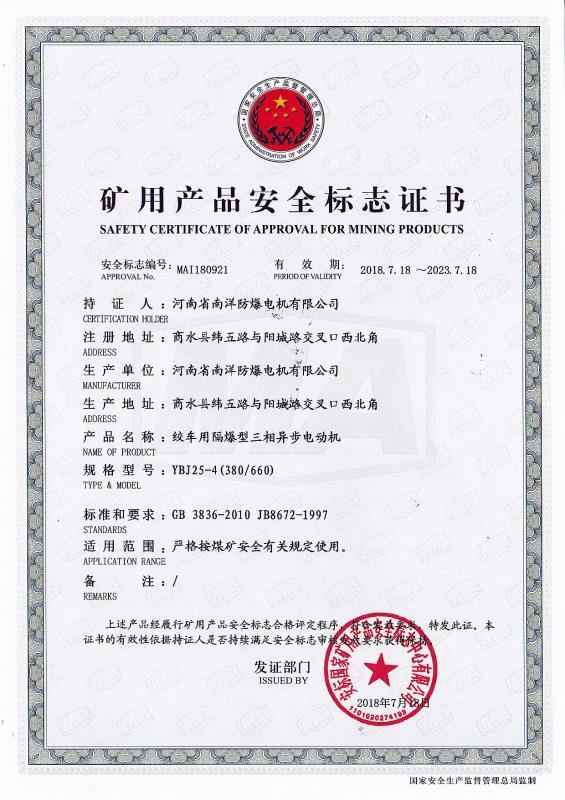 YBJ煤礦井下絞車用隔爆型三相異步電動機(jī)防爆合格證