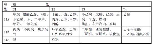 II 類 除煤礦外的其他爆炸性氣體環(huán)境用電氣設(shè)備。II 類爆炸性氣體的特性進(jìn)一步分類為:IIA、IIB、IIC。II 類常見可燃性氣體、蒸氣、溫度組別見下表 II 類 用于除煤礦以外的爆炸性粉塵環(huán)境,III 類再分類:IIIA 類:可燃性飛絮 ; IIIB類:非導(dǎo)電性粉塵;IIIC 類:導(dǎo)電性粉塵;