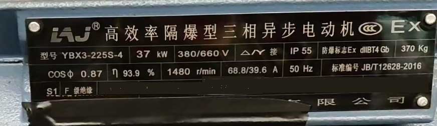 1、防爆電機(jī)型號:YBX3-225S-4防爆電機(jī);Y:代表三相異步電動機(jī),B:代表隔爆型;3:代表電機(jī)第三次設(shè)計;225:表示機(jī)座號,也就是防爆電機(jī)的中心高;S:表示短機(jī)座。